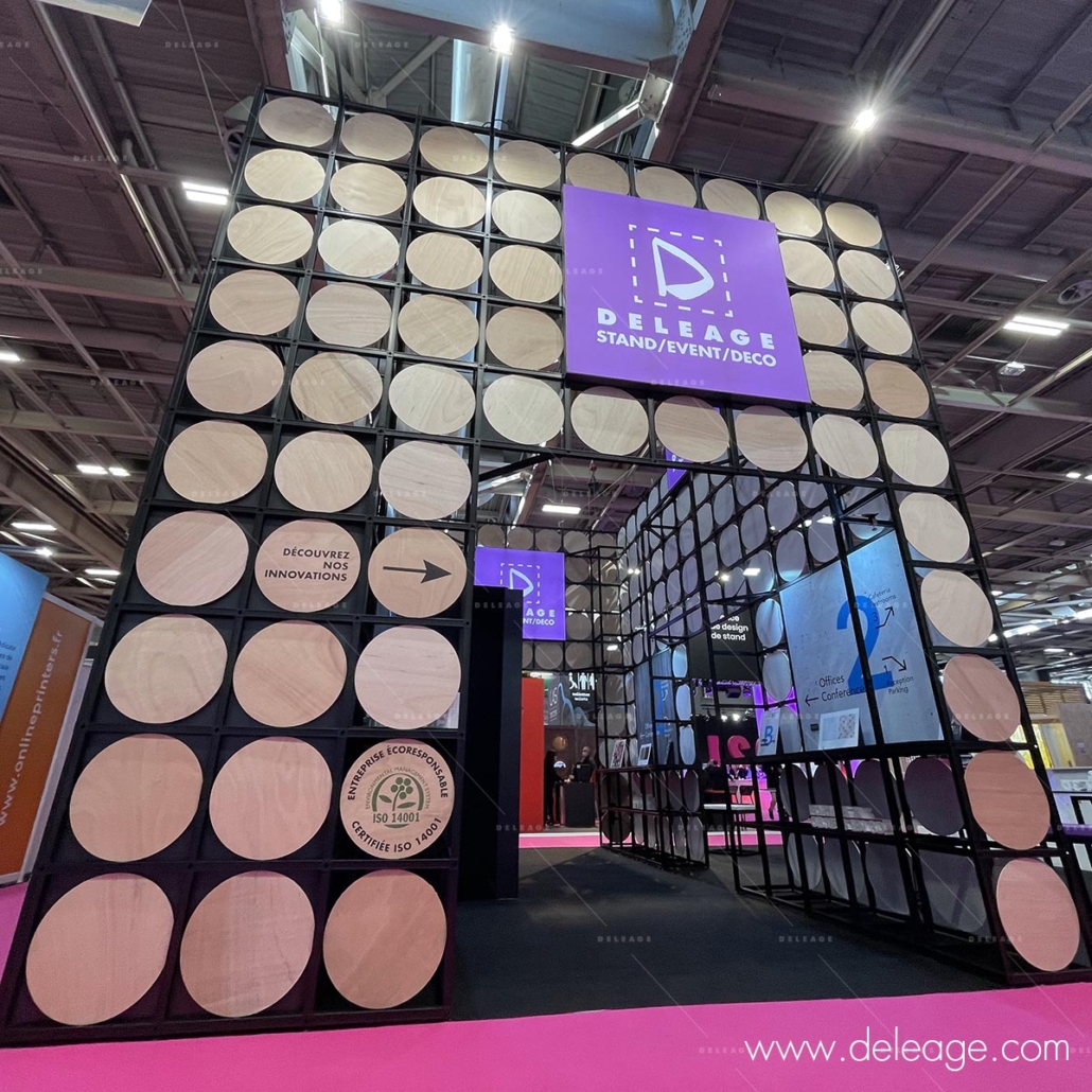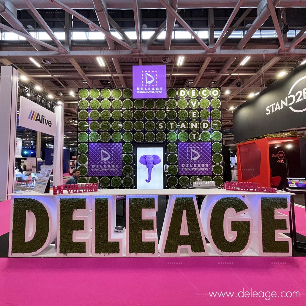 Concernant l’utilisation du tissu imprimé, le stand DELEAGE sur Heavent était surmonté de 3 light box avec tissu diffusant en recto verso et d’un grand mur de fond réalisé grâce à un tissu opaque imprimé en sublimation grand format et tendu en un seul morceau de 8m x 5m.