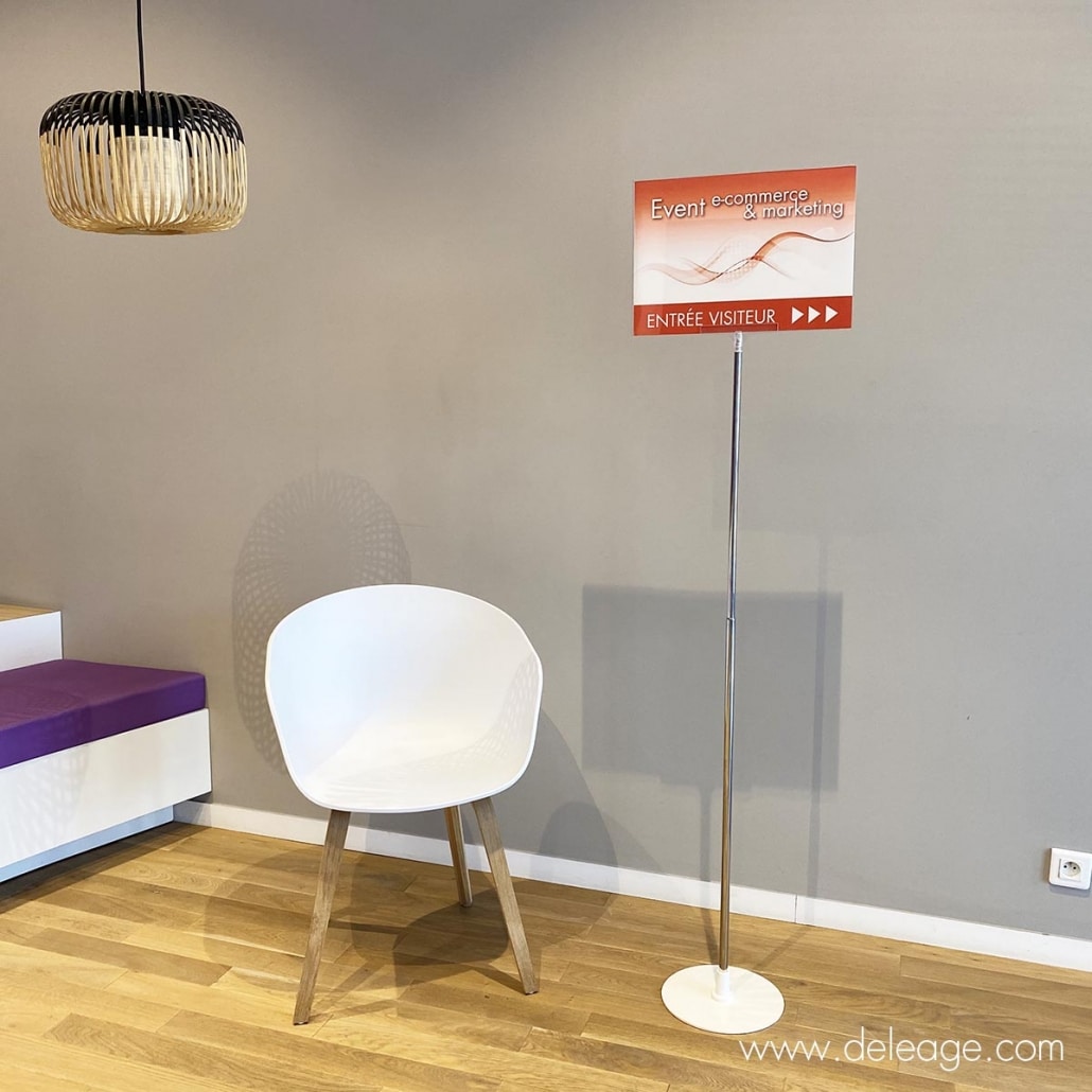 Un potelet porte affiche sur pied est un support de présentation composé d’une tige ou d’un mât qui peut être télescopique monté sur une embase au sol et dont l’extrémité supérieure se termine par une pochette plexi ou un cadre généralement pour feuillet A4 ou A3. Il existe des modèles chromés, en laiton, en inox ou en aluminium. Pour un usage plus industriel, vous pouvez également trouver des potelets porte affiches économiques réalisés en matière plastique.